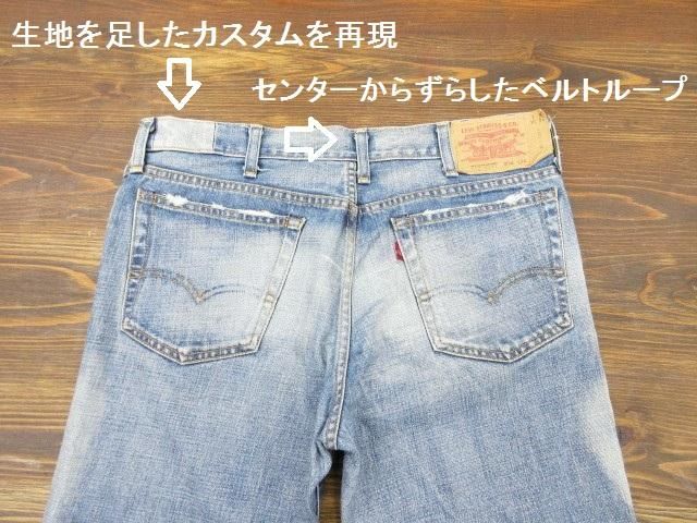 ウエストバンドの生地を追加したり、ベルトループをずらしてつけたりしてあります